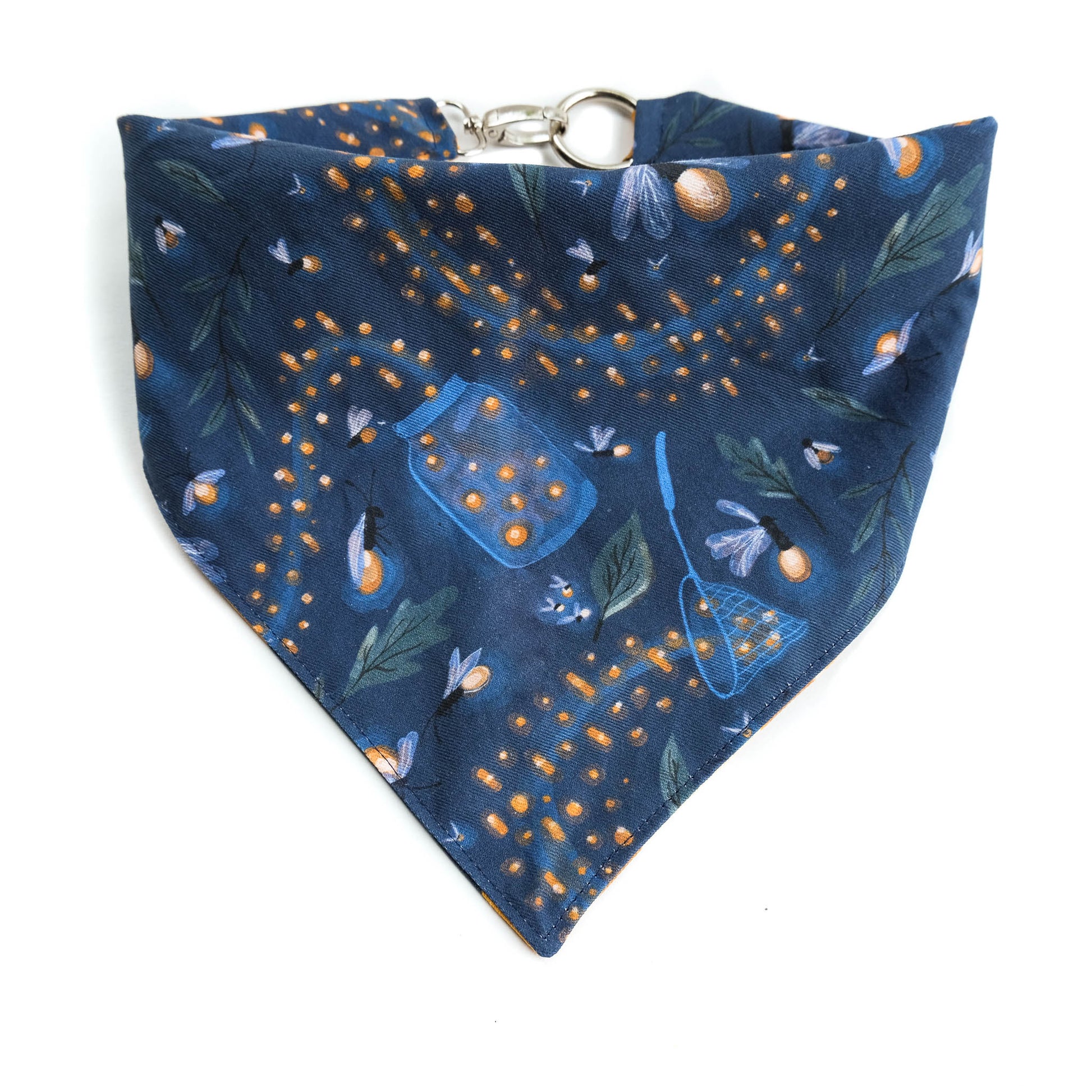 Your dogs will love all the extra attention they get when they show up to the BBQ wearing this unique reversible bandana. The reversible Firefly bandana is made from lightweight cotton twill fabric that is durable and easy to wash. Get the bandana wet before a hot summer hike to keep your dog cool along the way. The metal clip and ring makes it easy to clip around your wiggly dogs neck while also keeping the bandana secure when clipped to the ring on your dog's collar.