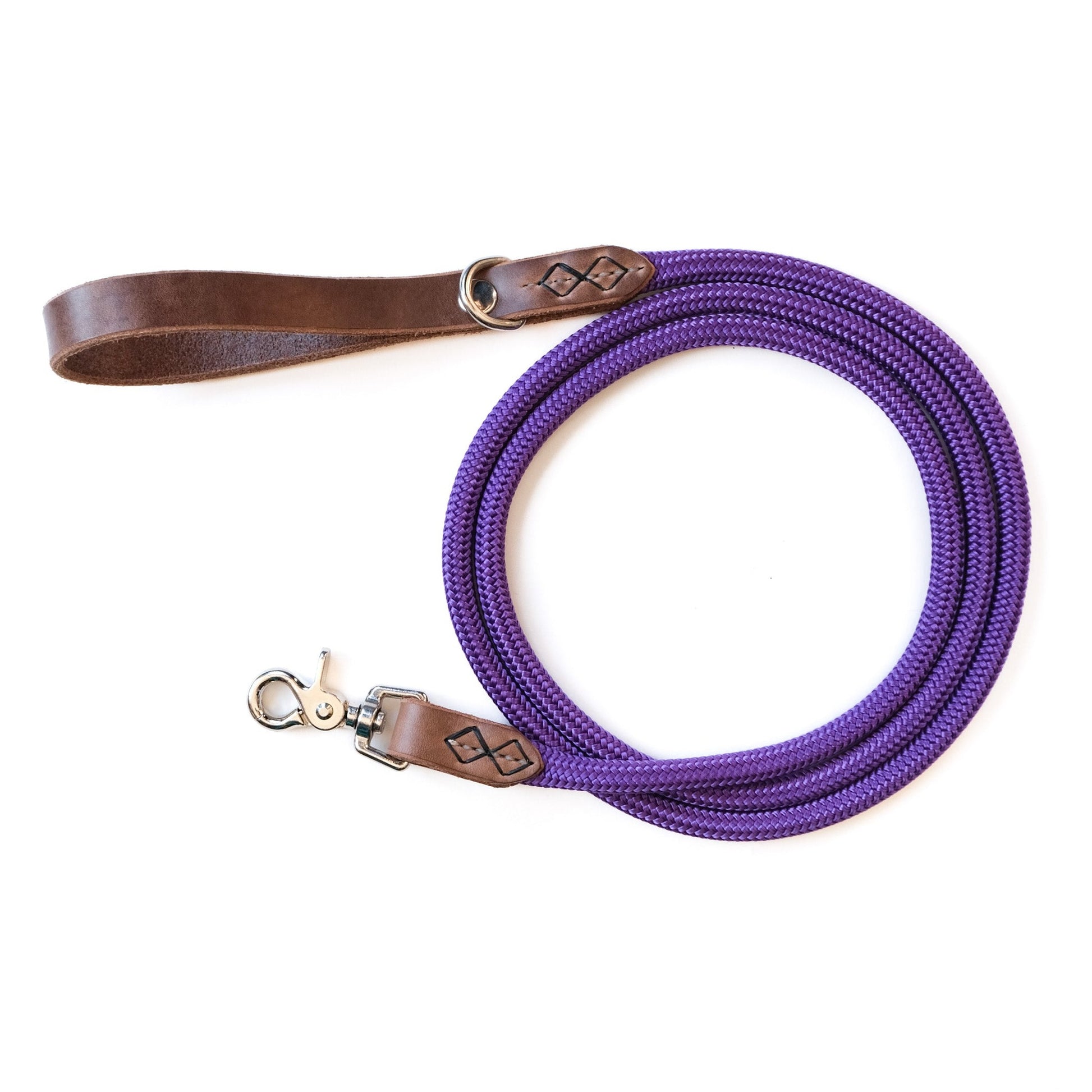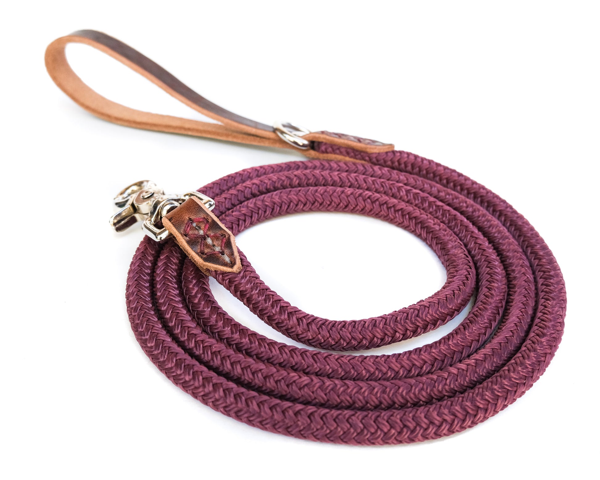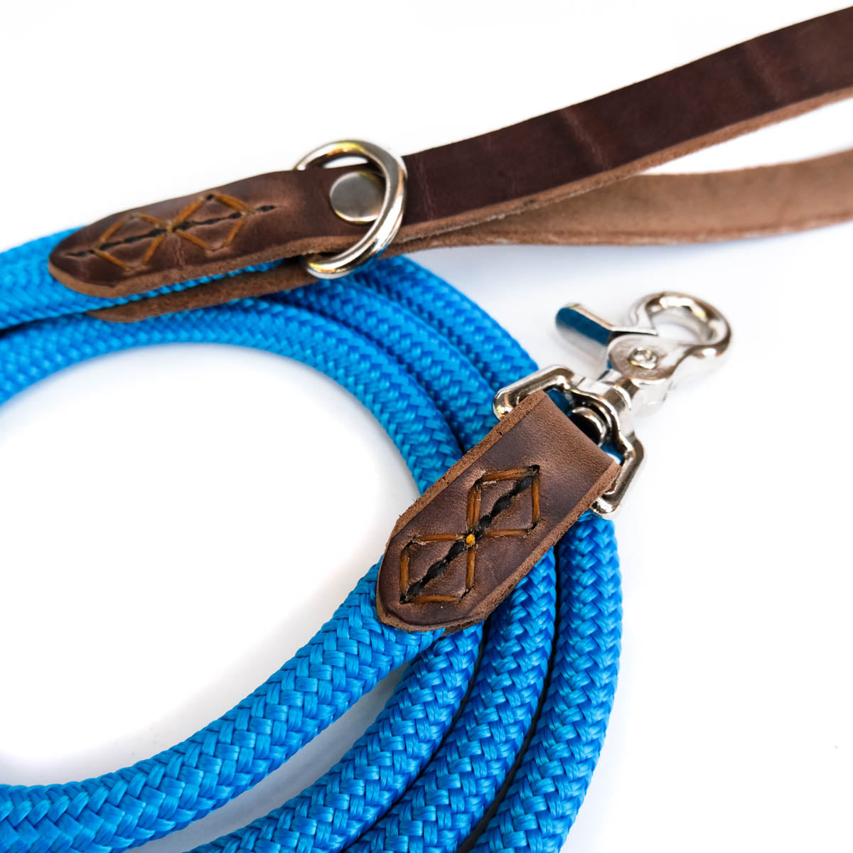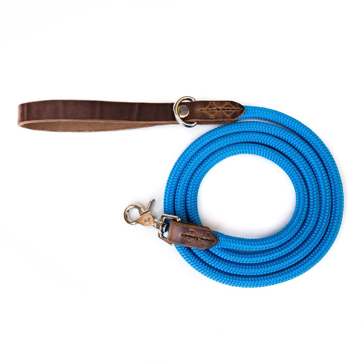 This rope and leather leash is designed for every adventure you and your dog experience. The genuine leather handle is soft on your hand but durable and strong. Unique stitching details add strength and beauty to the leather. Every leash features a metal d-ring for clipping on poop bag holders or wearing the leash cross body.